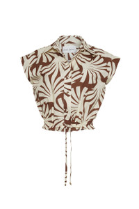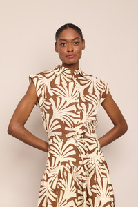 • Dropped shoulder collared top with ties • Center front functional placket opening • Ties at waist for adjustability • Ties have decorative gold cord ends • Cinched in look • Back waist has elastic for adjustability • Back bodice features a back yoke detail • Sleeve opening features a double rolled cuff • Unlined • Allover print Details • 100% Cotton Poplin • Dry Clean Only or Hand Wash Cold • Made in China