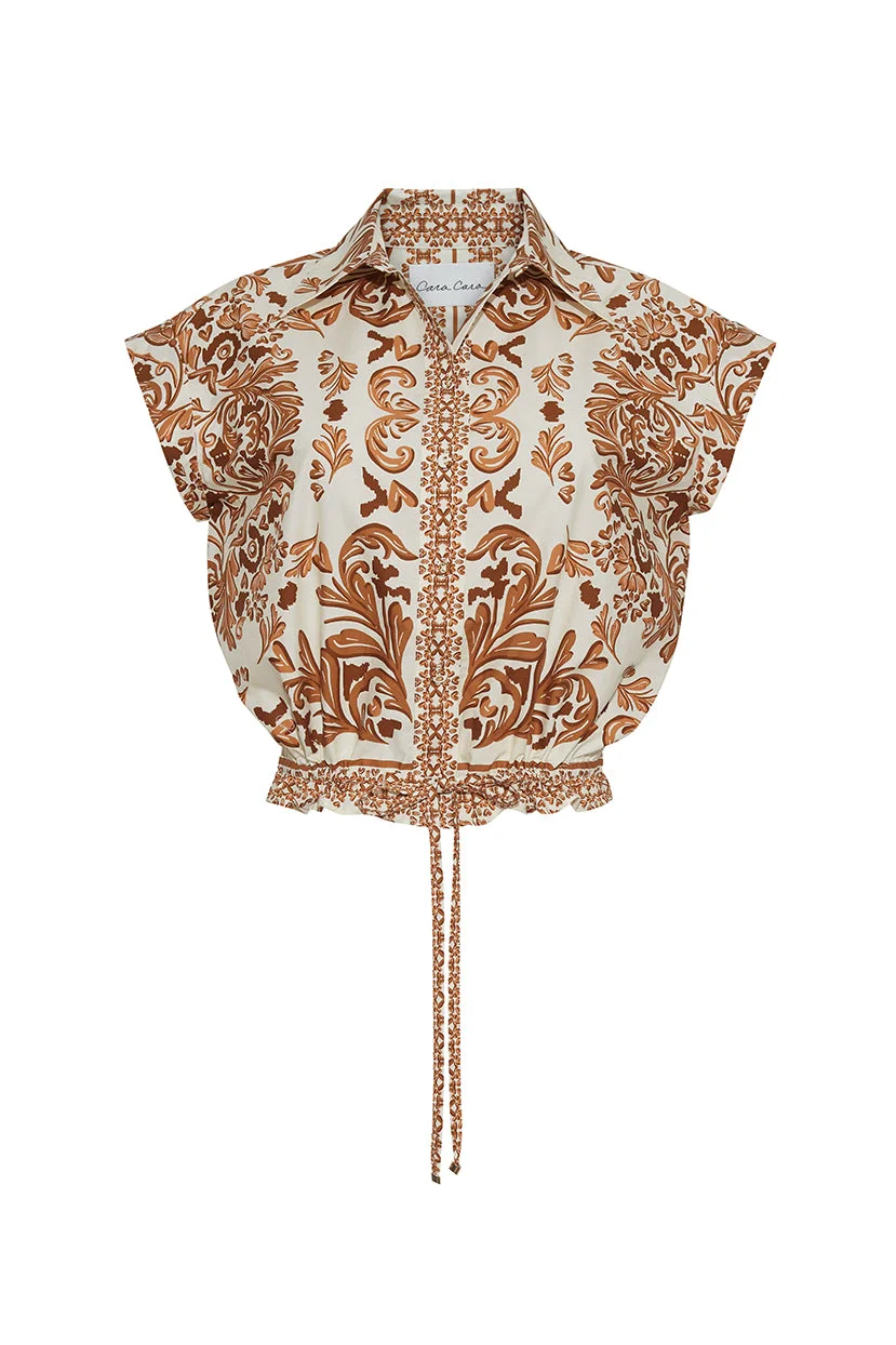 • Dropped shoulder collared top with ties • Center front functional placket opening • Ties at waist for adjustability • Ties have decorative gold cord ends • Cinched in look • Back waist has elastic for adjustability • Back bodice features a back yoke detail • Sleeve opening features a double rolled cuff • Unlined • Placed print Details • 100% Cotton Poplin • Dry Clean Only or Hand Wash Cold • Made in China
