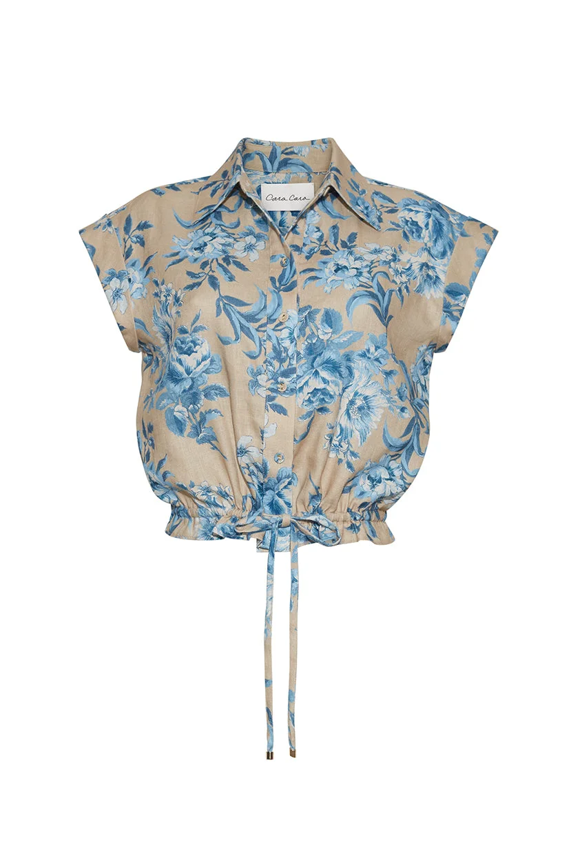 • Dropped shoulder collared top with ties • Center front functional placket opening • Ties at waist for adjustability • Ties have decorative gold cord ends • Cinched in look • Back waist has elastic for adjustability • Back bodice features a back yoke detail • Sleeve opening features a double rolled cuff • Unlined Details • 100% Linen • Dry Clean Only or Hand Wash Cold • Made in China