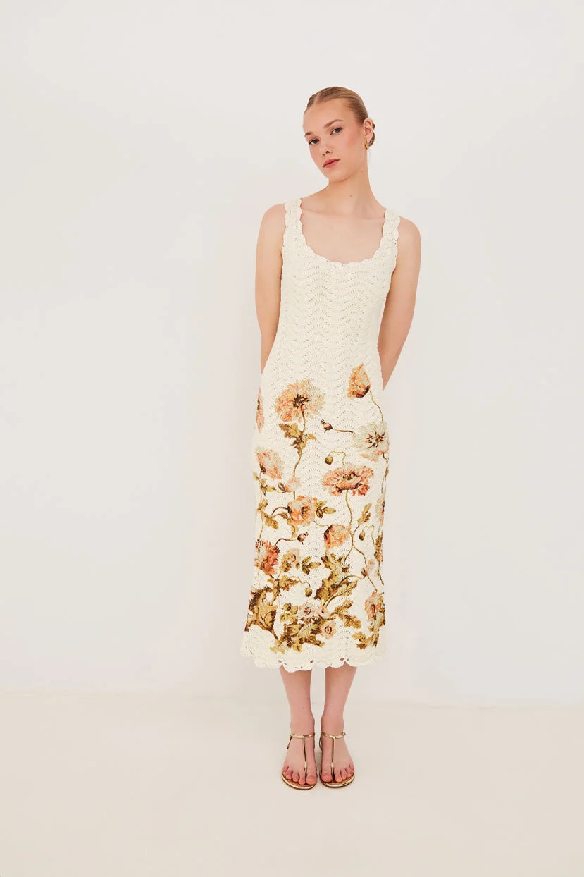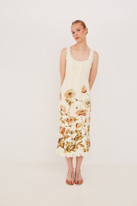 • Botanical printed cotton crochet dress with hand crochet trims with floral border print • Soft cotton lining • Fitted midi shape • Scoop neck tank dress • Textured wavy stitch • Pull on style This garment is special and might stretch over time if hung. To preserve its shape, we recommend taking extra care and folding. Details • 100% Cotton • Dry Clean Only or Hand Wash Cold • Made in China