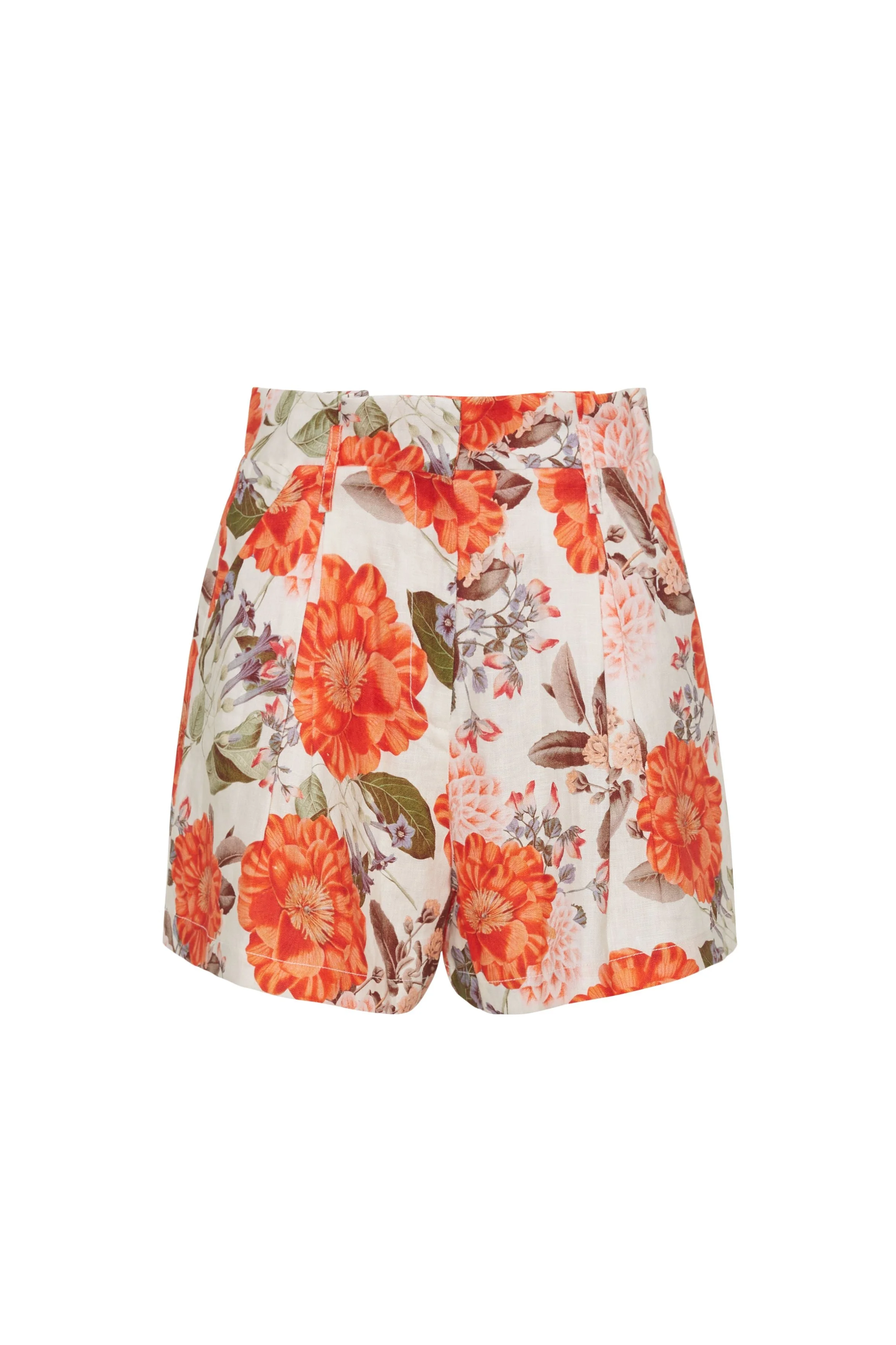 • Paperbag waisted shorts with pleats and functional pockets throughout • Belt loops for detachable self covered belt with raffia belt buckle • Functional pockets at sideseam and welt pockets at back • Functional zipper fly opening with metal hook-and-bar at fly opening • Inverted pleats at waistband at front and darts at back • Slips on • Lined • Allover print Details • 100% Linen; 100% Cotton Voile Lining • Dry Clean Only or Hand Wash Cold • Made in China