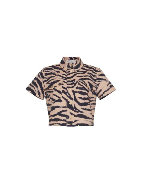 • Short sleeve button down printed cotton canvas shirt with front and back yokes with top stitching details • Front pockets with flaps and functional, novelty logo gold snaps • Boxy fit with side slits at hem • Bend back sleeve hem with top stitching detail • Unlined • Placed print Details • 100% Cotton • Dry Clean Only or Hand Wash Cold • Made in China