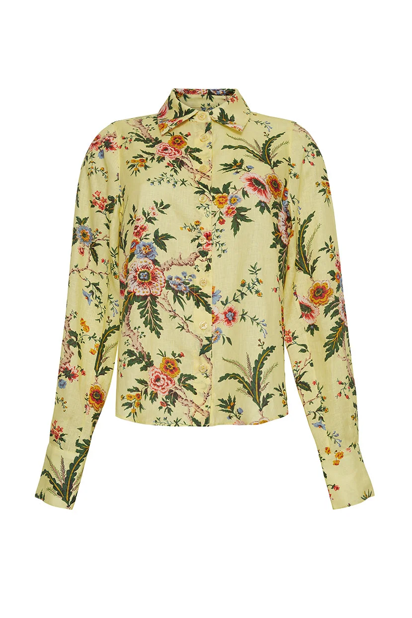 • Classic button down shirt with elongated cuffs • Center front placket button opening • Cuffs have a placket opening with two pleats • Center back yoke • Tiny side slits at hem • Unlined • Allover print Details • 100% Linen • Dry Clean Only or Hand Wash Cold • Made in China