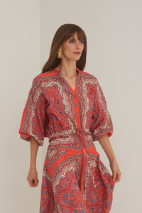 Cut from airy cotton voile, the Perrin Top has an easy, oversized silhouette that gathers with drawstring ties at the cropped hem. Wear it as a set with the matching Gabriella Skirt. • Unlined • Placed print Details • 100% Cotton Voile • Dry Clean Only or Hand Wash Cold • Made in India