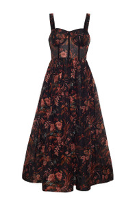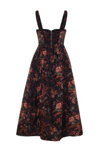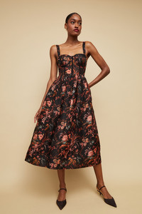 • Bustier midi dress with puff skirt and fitted bodice with exposed boning • Smocked back panel for ease with exposed zipper • Bodice cups with top stitch detail • Side seam pockets at skirt • Straps with elastic at back for ease • Puff skirt has tucks and gathers • Fully lined at skirt • Allover print Details • 52% Linen 48% Silk • Dry Clean Only or Hand Wash Cold • Made in China