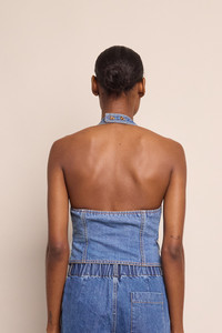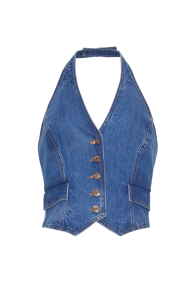 • V-neck halter fitted vest top with open back detail • Center front placket opening with metal shank buttons • Pocket flaps with hidden functional welt pockets • Princess seams at front and back for a fitted look • Button closure at center back neckline opening • Waisted silhouette • Unlined • Contrast top stitching detail allover Details • 100% Cotton • Dry Clean Only or Hand Wash Cold • Made in China