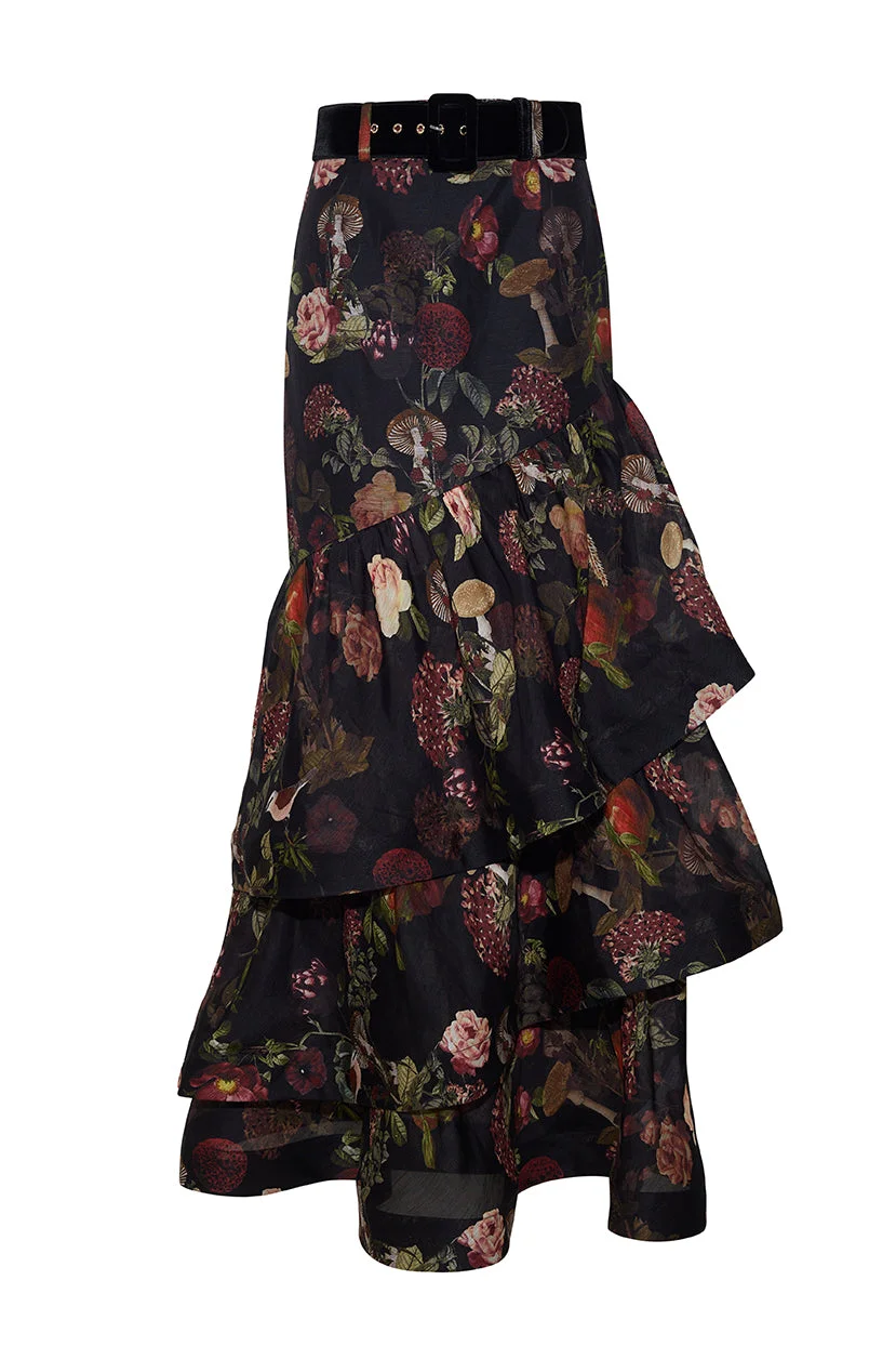 • Maxi asymmetrical fitted skirt with voluminous ruffles at tiers • Functional, removable self-covered belt with velvet covered square belt buckle • Center back zipper opening with hook-and-eye closure • Darts at front and back waist for fitted look • Fully lined except for tiers • Allover print Details • 52% Linen 48% Silk • Dry Clean Only or Hand Wash Cold • Made in China