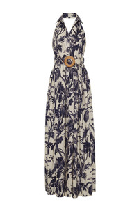 • Collared button down halter maxi dress with belted waist • Removable raffia buckle belt • Princess seams at bodice • Side seam pockets at shirred skirt • Smocking at center back • Bodice is lined, skirt is unlined • Center front placket has self covered functional buttons with gold eyelets • Allover print Details • 100% Cotton Poplin • Dry Clean Only or Hand Wash Cold • Made in China