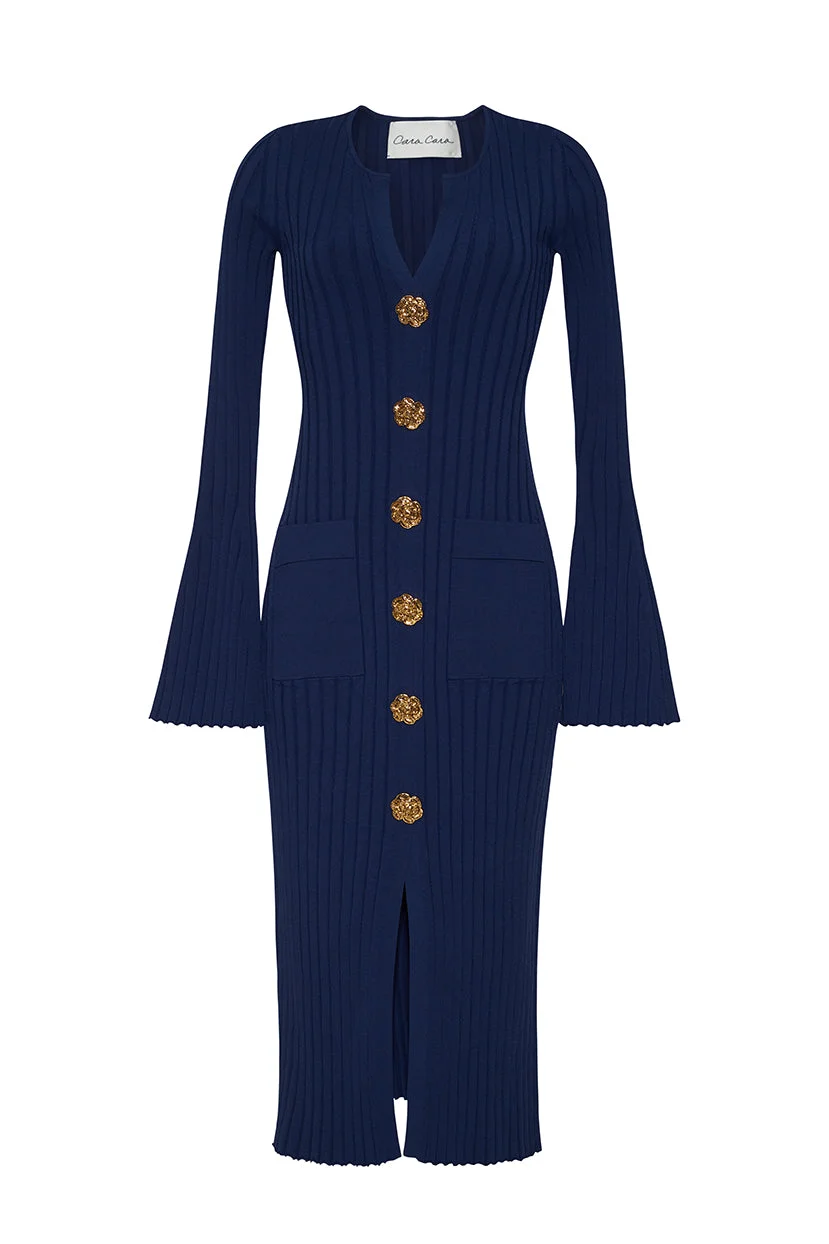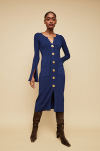 • Midi, long flared sleeve sheath dress with non-functional gold flower shank buttons • Crewneck • Slim fitted • Patch pockets at side front • Slits at sleeve hem • Rib knit • Slick knit This garment is special and might stretch over time if hung. To preserve its shape, we recommend taking extra care and folding. Details • 83% Viscose 17% Poly • Dry Clean Only or Hand Wash Cold • Made in China