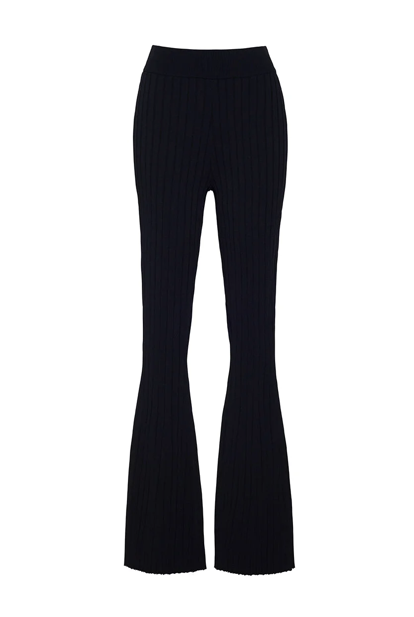 • Rib knit throughout the thigh and flares starting at the knee • Elasticated waistband • Fitted This garment is special and might stretch over time if hung. To preserve its shape, we recommend taking extra care and folding. Details • 83% Viscose 17% Poly • Dry Clean Only or Hand Wash Cold • Made in China