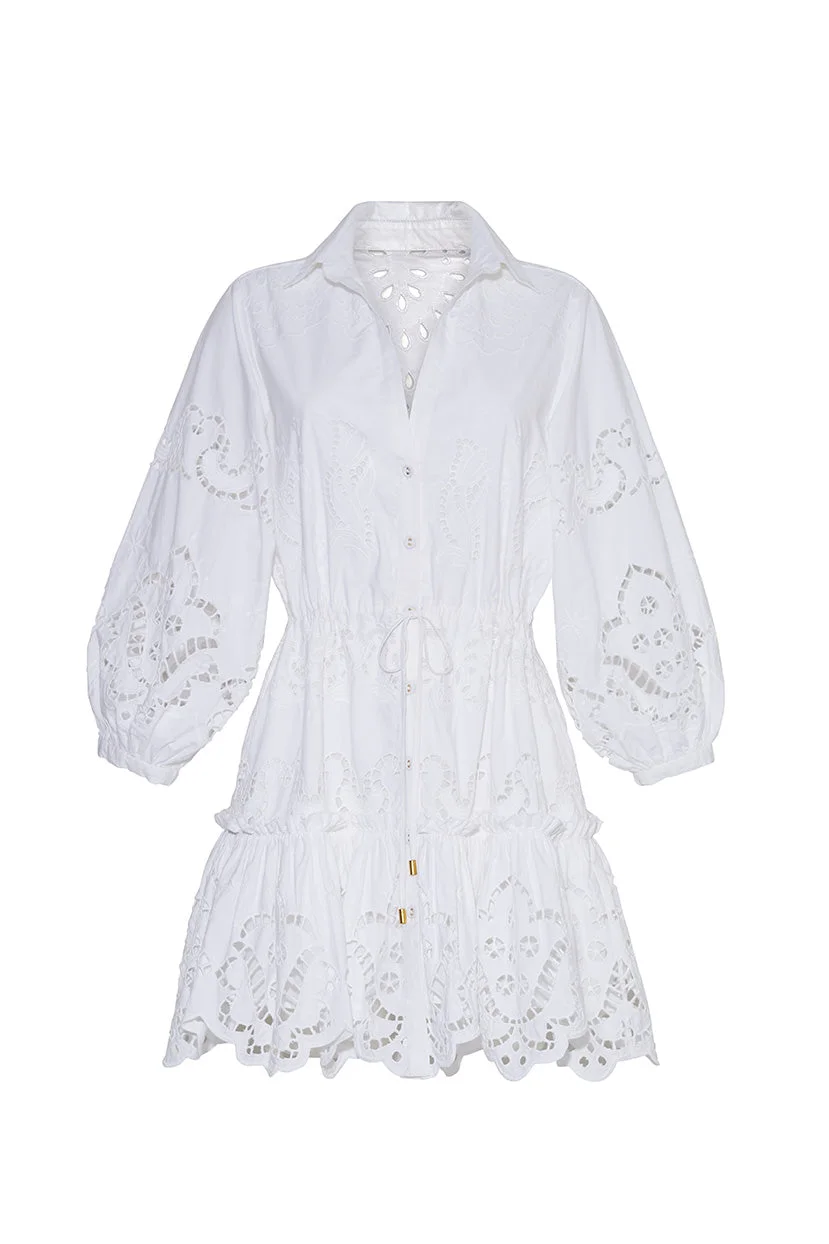 We took our best selling Hutton Dress and designed it into the most effortless, all-season piece. Featuring a tent dress silhouette with self-tie cinch waist and ruffle tier skirt. Team with statement jewels and heels or a chunky knit and sneakers for maximum versatility. Embroidered cotton poplin. Collared neckline. Drawstring waistband. Puffed sleeves. Hem falls above the knee. Unlined. Three button front placket. Sized for an easy fit. Details • 100% Embroidered Cotton Poplin • Dry Clean Only or Hand Wash Cold • Made in India Our model is 5'11"/180cm, bust size 32"/81cm, waist size 25"/63.5cm and is wearing a size S.