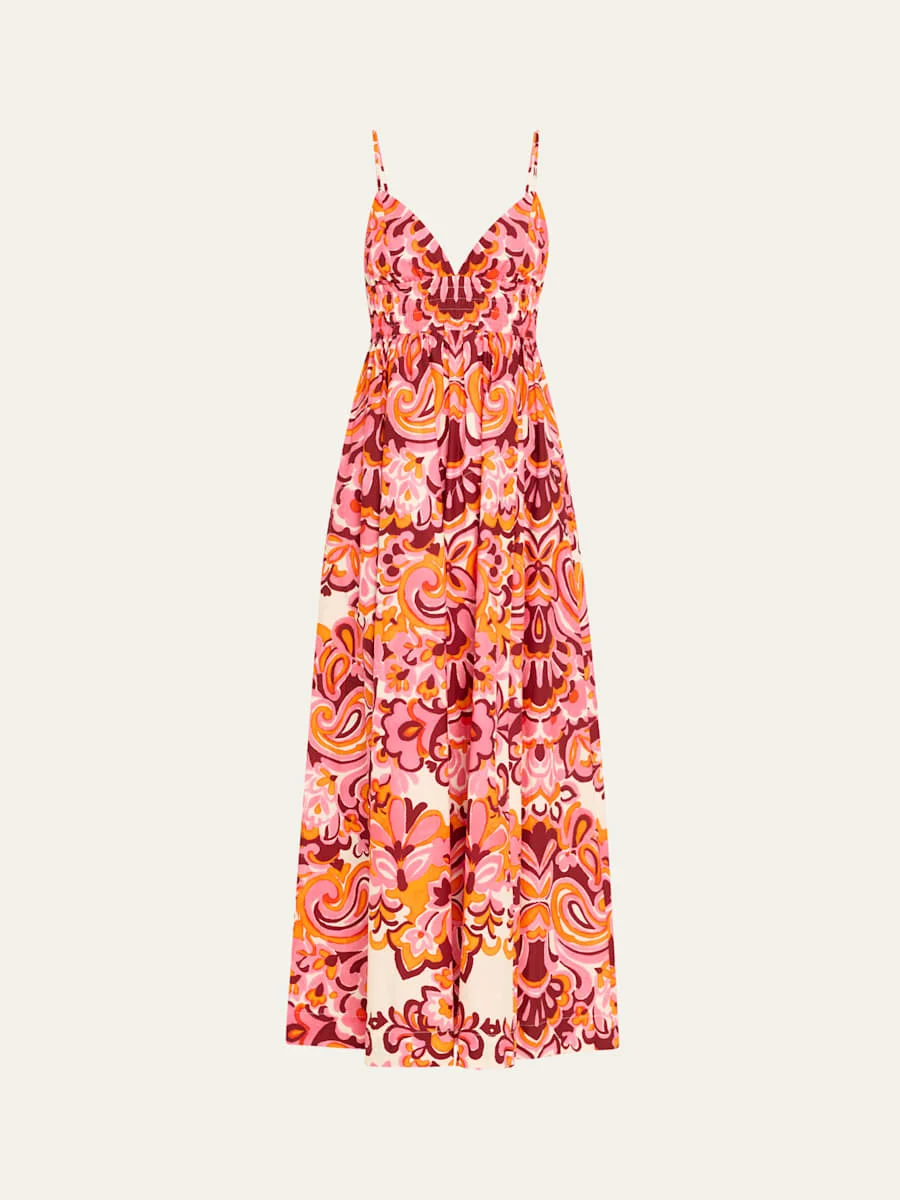 Cara Cara "Rue" cotton maxi in a vibrant all-over print V neckline Sleeveless Smocked empire waistband Fit-and-flare silhouette Full length Slipover style Cotton Dry clean Imported Online Inquiries: BGS21_T6U69| Store Inquiries: #5036236