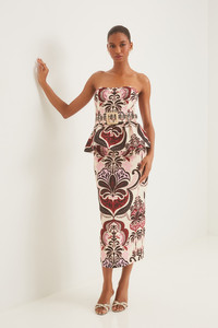 • Midi length fitted pencil skirt • Center back zipper opening with hook-and-eye closure • Center back vent opening • Darts at front and back for a waisted look • Placed print • Fully lined Details • 100% Linen; 100% Cotton Voile Lining • Dry Clean Only or Hand Wash Cold • Made in China