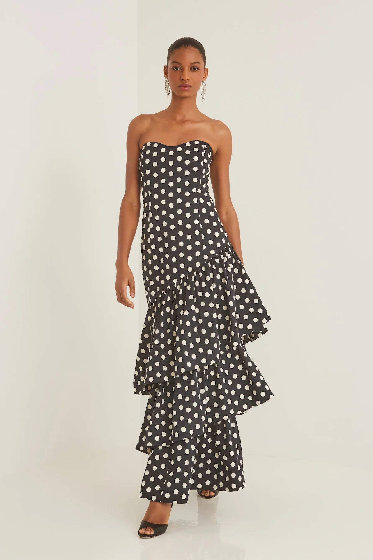 • Strapless gown with three asymmetrical ruffled tiers • Princess seams at front and back for fitted look • Sweetheart neckline • Boning at interior princess seams and side seams • Metal zipper at center back seam with hook-and-eye at top edge • Fully lined • Asymmetrical tiers have gathers cut on bias • Allover print Details • 97% Cotton 3% Spandex • Dry Clean Only or Hand Wash Cold • Made in China