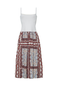 • Tank knit to woven combo midi dress • Adjustable straps • Fitted bodice • Full skirt • Functional side seam pocket bags This garment is special and might stretch over time if hung. To preserve its shape, we recommend taking extra care and folding. Details • 80% Viscose 16% Poly 3% Nylon 1% Spandex • Skirt 100% Cotton • China