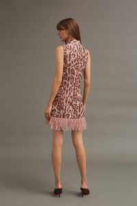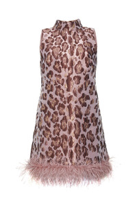 • Sleeveless shift dress with decorative mock-neck detail and feather detail at bottom hem • Center back zipper opening with hook-and-eye closure • Bra friendly • Fully lined • Functional side pockets • Animal woven jacquard in rose gold and blush • Jacquard pattern is placed This fabric is very special and should be treated with extra care to preserve its beauty. To prevent snagging, we recommend using a garment cover and to avoid storing next to items that may cause damages such as sequins, rhinestones, or embroidery. Alternatively, consider hanging on a padded hanger. Details • 85% Poly 10% Metallic 5% Nylon; 100% Poly Lining • Dry Clean Only or Hand Wash Cold • Made in China
