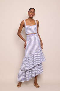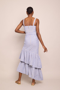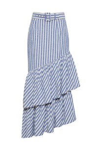 • Fitted, high-waisted queen body-con skirt with two tiers of voluminous asymmetrical ruffles at hem • Fully lined in poly stretch lining • Center back zipper opening • Separate belt in self • Has darts for shaping at front and back of the waistband • Center back zipper opening Details • 50% Viscose, 36% Cotton, 14% Polyamide • Dry Clean Only or Hand Wash Cold • Made in China
