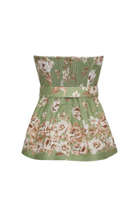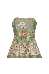 • Strapless peplum top with sweetheart neckline • Fitted bodice is fully lined, peplum is unlined • Center back smocking panel for adjustability • Center back zipper opening with hook-and-eye • Peplum has shirring and tucks detail • Front bodice has horizontal dart for shape • Bodice has princess seams for shape • Separate belt with raffia buckle • Placed print • Peplum hem has a internal horsehair trim for more kick • Bodice features boning tape at side seams and front and back princess seams Details • 100% Linen; 100% Cotton Lining • Dry Clean Only or Hand Wash Cold • Made in China