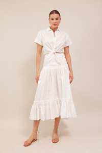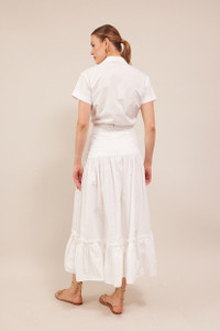 The Tisbury Skirt balances a bohemian spirit with a polished fit. The high-low, tiered ruffle skirt has just enough volume to feel special while being casual enough to knot your favorite t-shirt on top for a playful look. A-line silhouette with a wide yoke at the high-rise waist. Concealed zip fastening along back. Details • 100% Cotton Poplin • Dry Clean Only or Hand Wash Cold • Made in China Our model is 5'11"/180cm, bust size 32B/81cm, waist size 24"/61cm and is wearing a size Small.