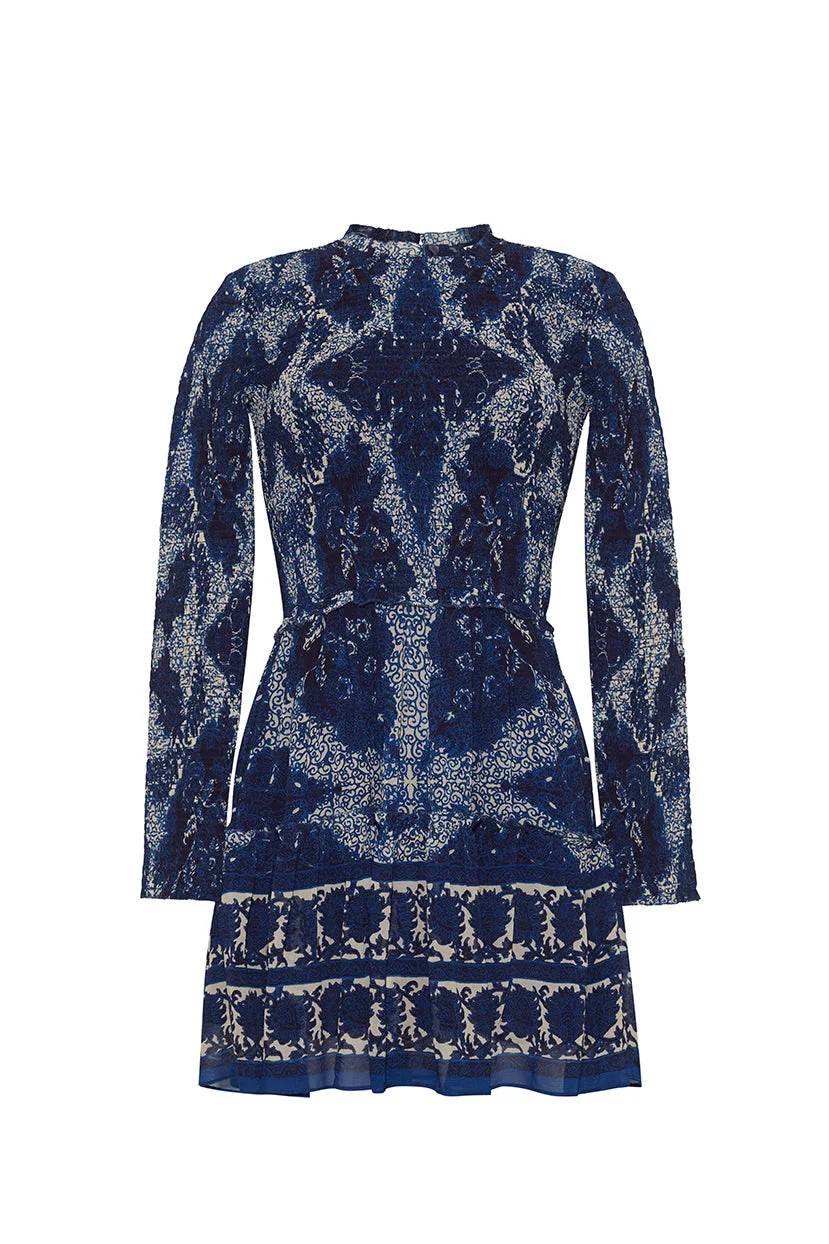 The Viola Dress offers easy autumn luxury. This long-sleeved mini features textural interest in micro-ruffles at the skirt and waist and a smocked front panel with contrast stitching. • Printed viscose georgette • Invisible back zip with hook-and-eye closure • Fully lined except for sleeves • Side-seam pockets • Ruffle hem at sleeve hem We recommend folding flat to preserve the shape, as this style has a tendency to lengthen when hung on a hanger. Details • 100% Viscose • Dry Clean Only or Hand Wash Cold • Made in India