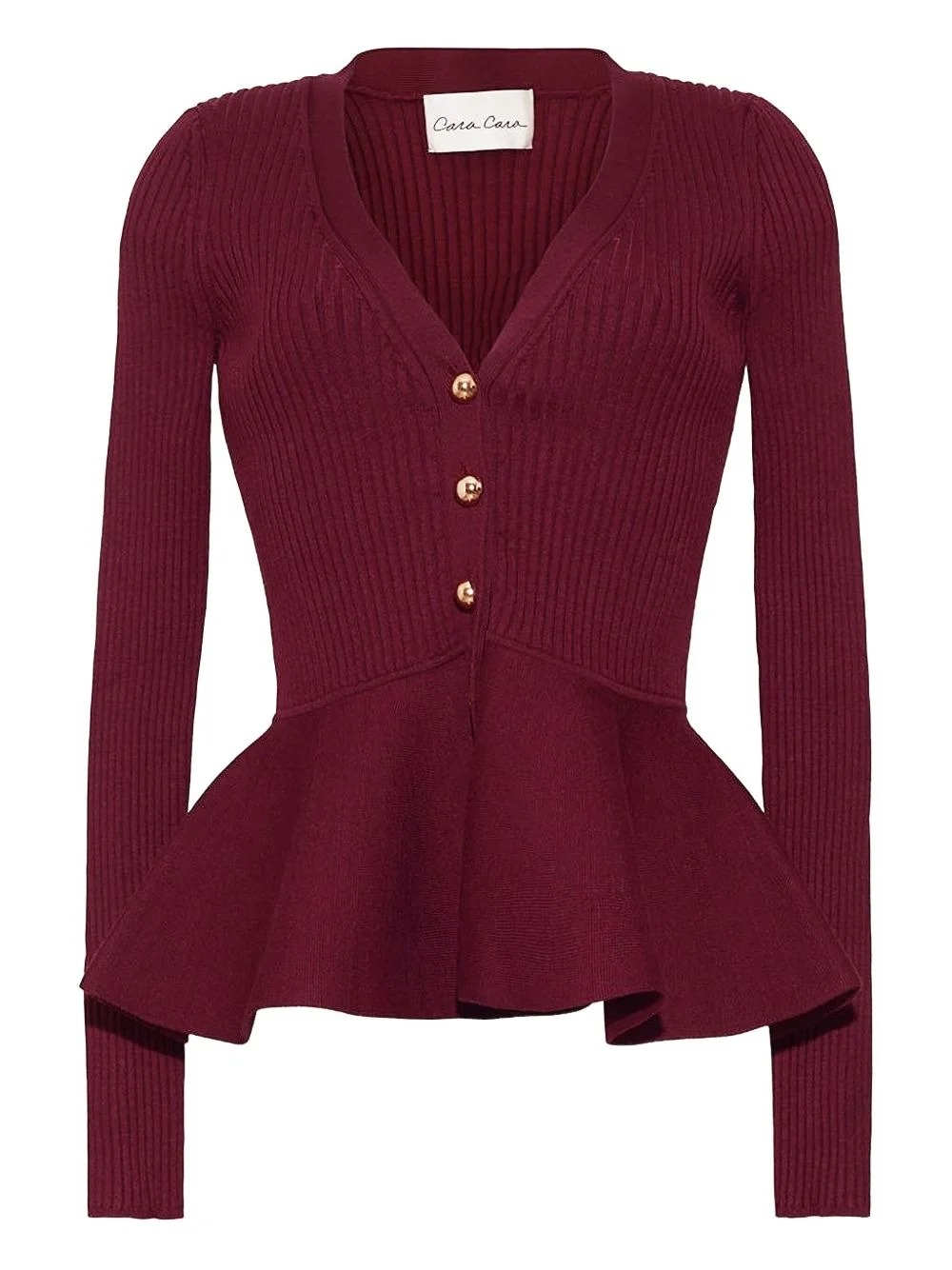 Viva ribbed buttoned top Highlights - Burgundy - Ribbed knit - V-neck - Peplum hem - Long sleeves - Gold-tone buttons Imported Composition Viscose 66%, Polyester 28%, Nylon 5%, Spandex/Elastane 1% Washing instructions Read Manufacturer Guidelines