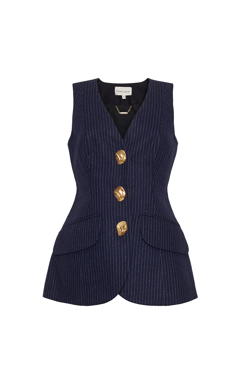 • Italian pinstriped fabric • Shaped, structured, long lined vest with functional flap pockets at front • Princess seams at front and back • Non-functional, decorative buttons at front opening with self covered snaps on interior • Fully lined • Two baby snaps on interior for additional support • Fitted waist with dramatic kick Details • 67% Wool 30% Nylon 3% Other • Dry Clean Only or Hand Wash Cold • Made in China