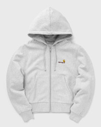 The loose-fitting Hooded American Script Jacket from Carhartt WIP is made from a heavy polyester-cotton jersey that has been brushed for a fleece-like interior. It features an adjustable hood, a zipper and a split kangaroo pocket. An American Script logo on the chest completes the design. - Adjustable hood - Kangaroo pocket - Ribbed cuffs and hem Article Number: I033057-482.XX Gender: Women Color: Ash Heather Material: 74% Cotton, 26% Polyester
