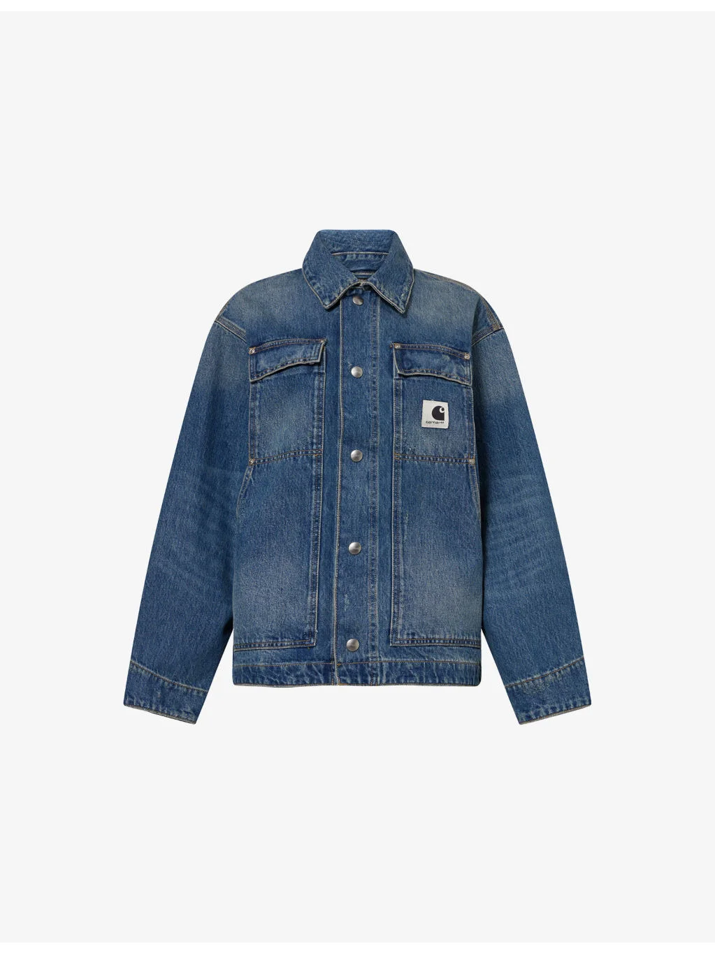 PRODUCT DETAILS - Carhartt WIP denim jacket - 100% cotton - Popper fastening - Oversized boxy fit, long sleeves, adjustable poppers at cuffs, flap pockets and brand patch at chest, slip pockets at front, branded hardware, distressed denim patches - Machine wash at 40°C - Made in Tunisia - True to size - Model is 5ft 10in/1.78m and wears a size small - Midweight, slight stretch Ref: R04566723