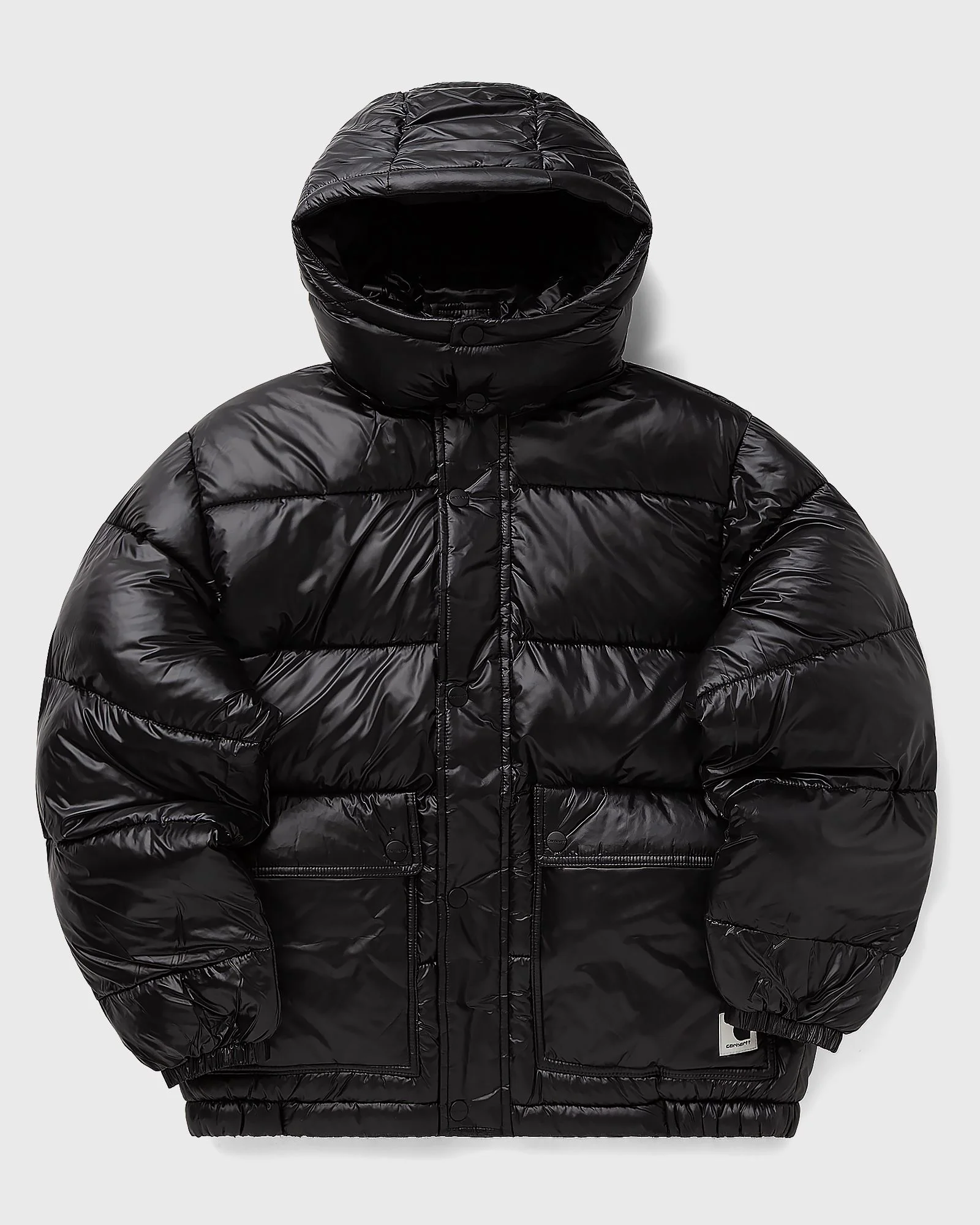 The Carhartt WIP Benson Jacket is made of polyester and padded with synthetic down for extra warmth. It features a stand-up collar and a removable, adjustable hood. There are two patch pockets on the front. A woven square label completes the design. - Filling: Synthetic down - Stand-up collar - Elastic cuffs and hem - Adjustable and removable hood - Concealed two-way zipper and snap buttons - Two front pockets with snap buttons and side access - Square label Article number: I035370-89.XX Gender: women Color: black Material: 100% Polyester