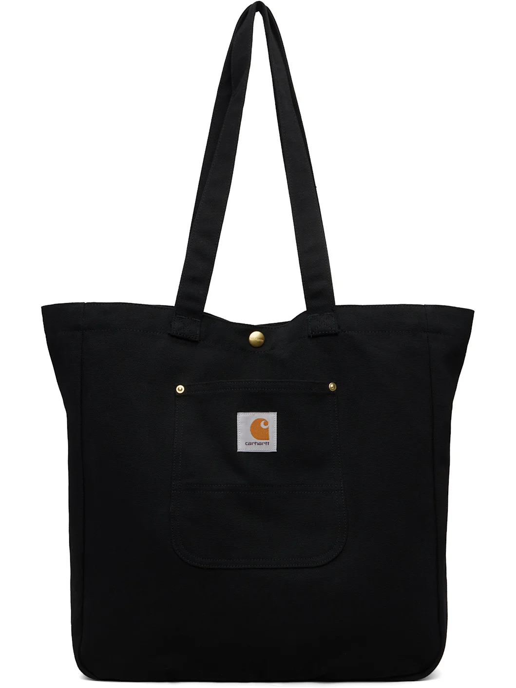Organic cotton canvas tote. · Fixed twin shoulder straps · Patch pocket with logo patch at face · Press-stud closure · Zip pocket at interior · Plain-woven cotton lining · Logo-engraved antiqued brass-tone hardware · H15" x W19.5" x D4.5" Supplier color: Black Body: 100% organic cotton. Lining: 100% cotton. Made in Tunisia 261111F049003