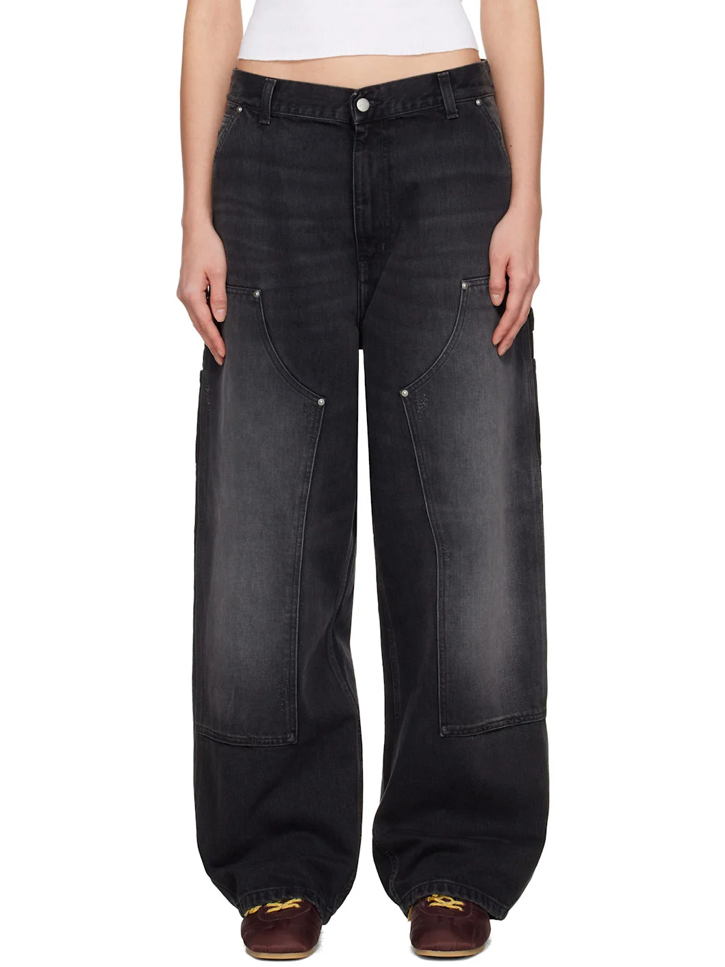 Heavyweight 13.5 oz non-stretch denim jeans. · Fading, whiskering, and distressing throughout · Wide-leg · Mid-rise · Belt loops · Five-pocket styling · Zip fly · Reinforced panel at legs · Logo patch at back pocket · Hammer loop and patch pockets at outseams · Silver-tone hardware Supplier color: Black (Stone Washed) Body: 100% cotton. Pocket lining: 65% polyester, 35% cotton. Made in Tunisia 261111F069018