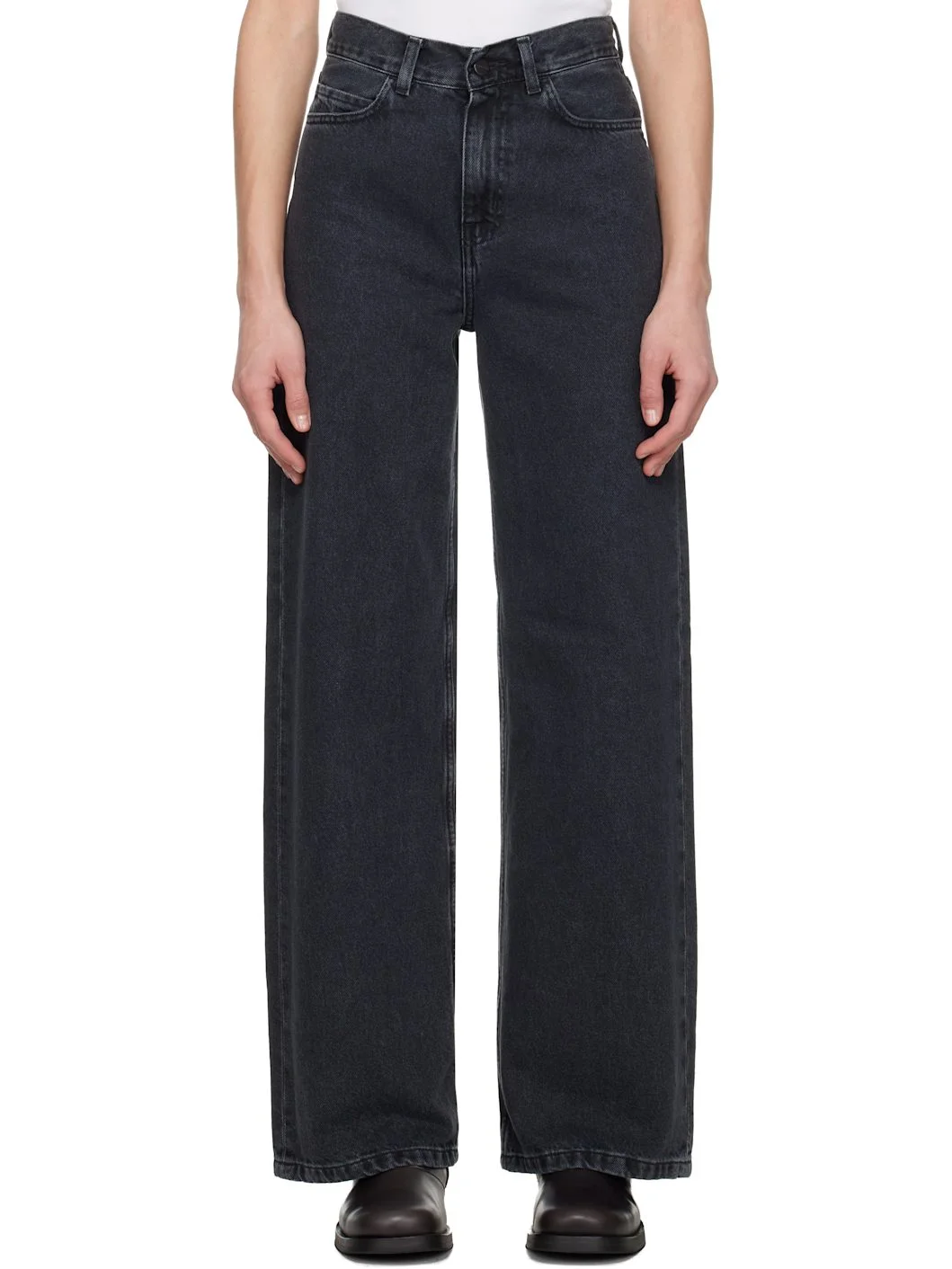 Non-stretch 11.5 oz organic cotton denim jeans. · Stonewashed · Fading throughout · Loose-fit, flared · High-rise · Belt loops · Five-pocket styling · Zip fly · Logo patch at back pocket · Logo-engraved gunmetal-tone hardware Supplier color: Black (heavy stone wash) 100% organic cotton. Made in Tunisia 261111F069007