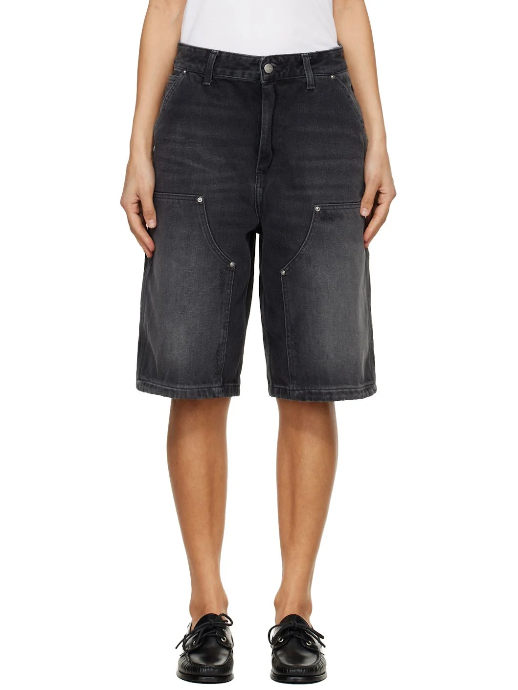 Non-stretch denim shorts. · Fading, whiskering, and distressing throughout · Belt loops · Five-pocket styling · Zip fly · Patch pockets at outseam · Hammer loop and patch pocket and outseam · Logo patch at back pocket Supplier color: Black Body: 100% cotton. Trim: 65% polyester, 35% cotton. Made in Tunisia 261111F088000