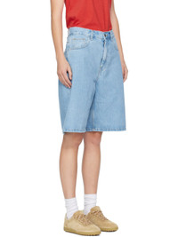 13.5 oz non-stretch denim shorts. · Fading throughout · Mid-rise · Belt loops · Five-pocket styling · Zip fly · Logo patch at back pocket · Contrast stitching in tan Supplier color: Blue (stone bleached) Body: 100% cotton. Trim: 65% polyester, 35% cotton. Made in Tunisia 252111F088002