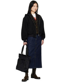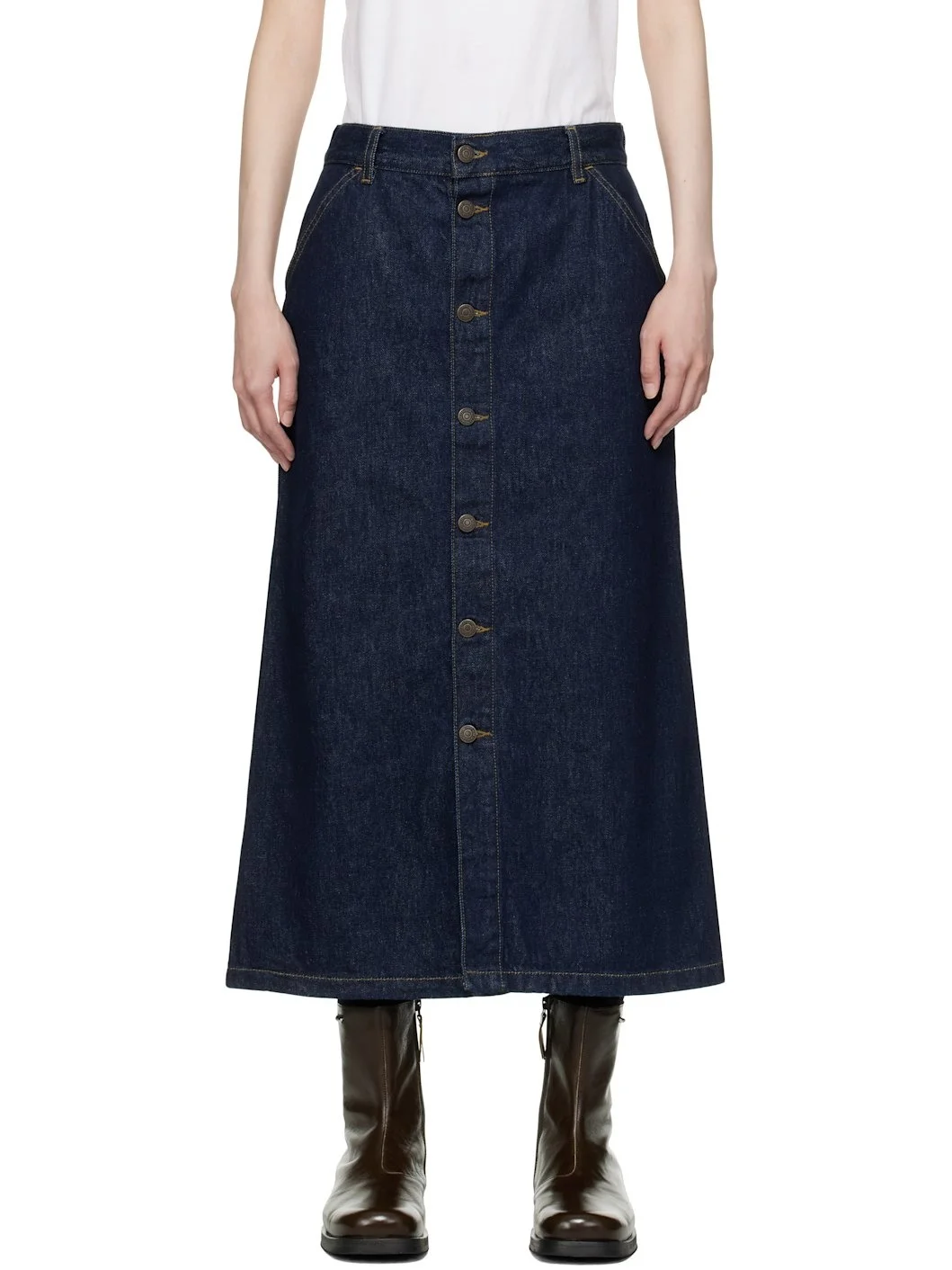 Non-stretch denim midi skirt. · Belt loops · Four-pocket styling · Button closure · Central vent at front hem · Faux-leather logo patch at back pocket · Logo-engraved bronze-tone hardware · Contrast stitching in tan Supplier color: Rinsed blue 100% cotton. Made in Tunisia 251111F092001