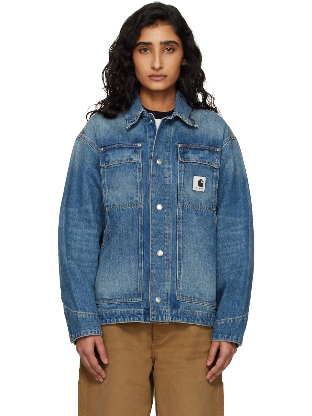 13.5 oz non-stretch denim jacket. · Fading and whiskering throughout · Spread collar · Press-stud closure · Logo patch at chest · Flap pockets at chest · Patch pockets at waist · Adjustable press-stud barrel cuffs · Adjustable press-stud tabs at back hem · Contrast stitching in tan Supplier color: Blue 100% cotton. Made in Tunisia 261111F060003