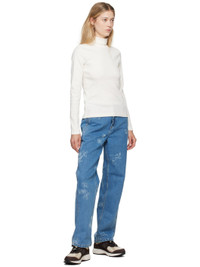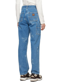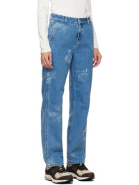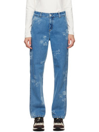 Loose-fit tapered heavyweight and stonewashed non-stretch organic cotton jeans. Graphics printed throughout. · Mid-rise · Belt loops · Four-pocket styling · Zip-fly · Patch pockets at outseam · Hammer loop and patch pocket at outseam · Leather logo patch at back pocket · Contrast stitching in beige Supplier color: Blue rinsed Body: 100% organic cotton. Lining: 65% polyester, 35% cotton. Made in Tunisia 242111F069013