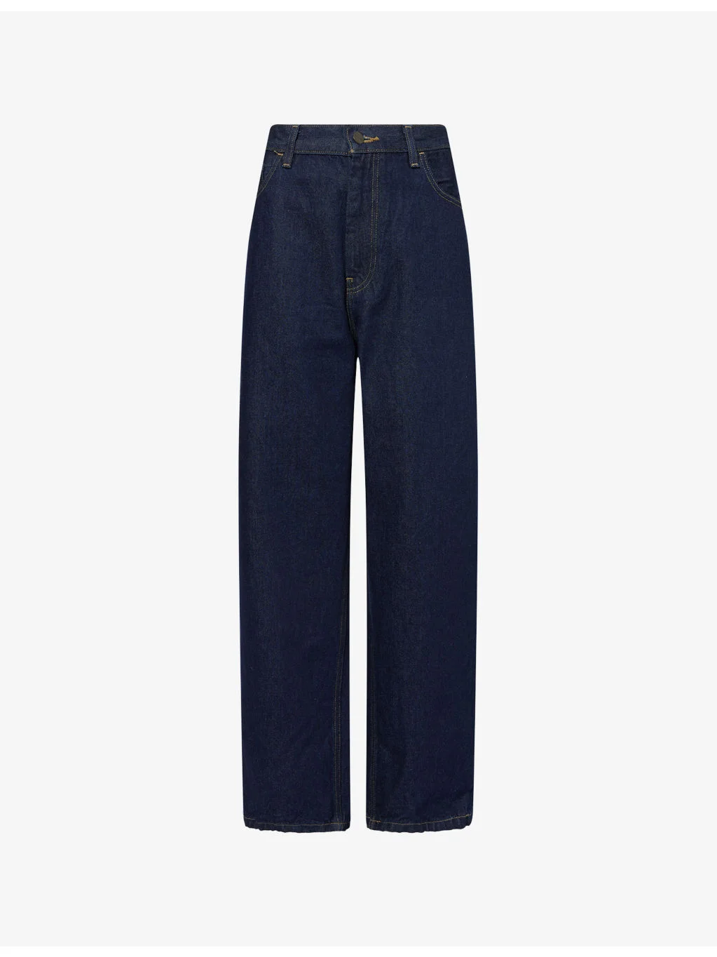 PRODUCT DETAILS - Carhartt WIP denim jeans - 100% cotton - Button and zip-fly fastening - Relaxed fit, high-rise, wide leg, belt loops, five pockets, brand patch at back - Machine wash cold - True to size - Size UK 8: rise 14in / 37cm, inside leg 28in / 72cm, leg opening 18in / 46cm - Model is 5ft 10in/1.78m and wears a size UK 8 - Midweight, non-stretch Ref: R04566705