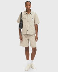 The Carhartt WIP Branford Double Knee Short is made from a mid-weight cotton-linen fabric and has a loose fit with a regular rise. The style has been piece-dyed for a softer feel and a more complex colorway. Double-layered knees, tool pockets and a hammer loop are reminiscent of the style's functional roots. A woven square label rounds off the design. - Loose fit, normal waist height - Triple seams - Double-layered knees - Bar seams or rivets in frequently used areas - Tool pockets and hammer loop - Script logo on the inside of the waistband - Zipper - Square label Article Number: I035574-05.02 Gender: Women Color: Natural Material: 58% Cotton, 42% Linen