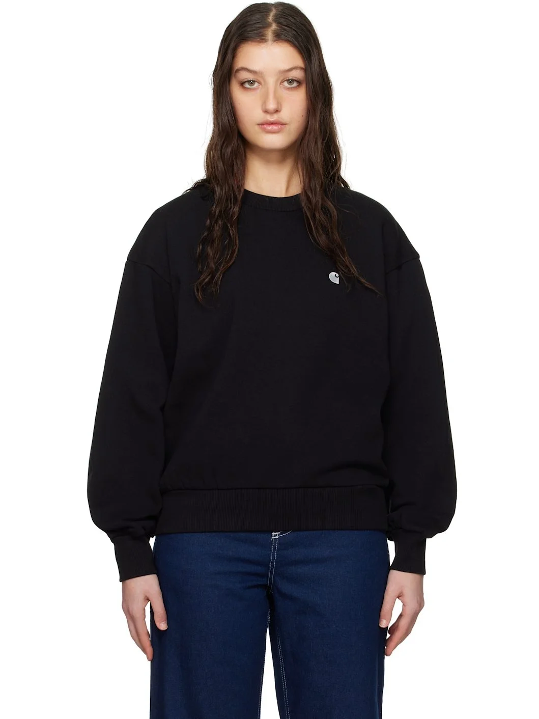 Heavyweight 420 gsm cotton fleece sweatshirt. · Garment-washed · Rib-knit crewneck, hem, and cuffs · Logo embroidered at chest · Dropped shoulders Supplier color: Black/Silver