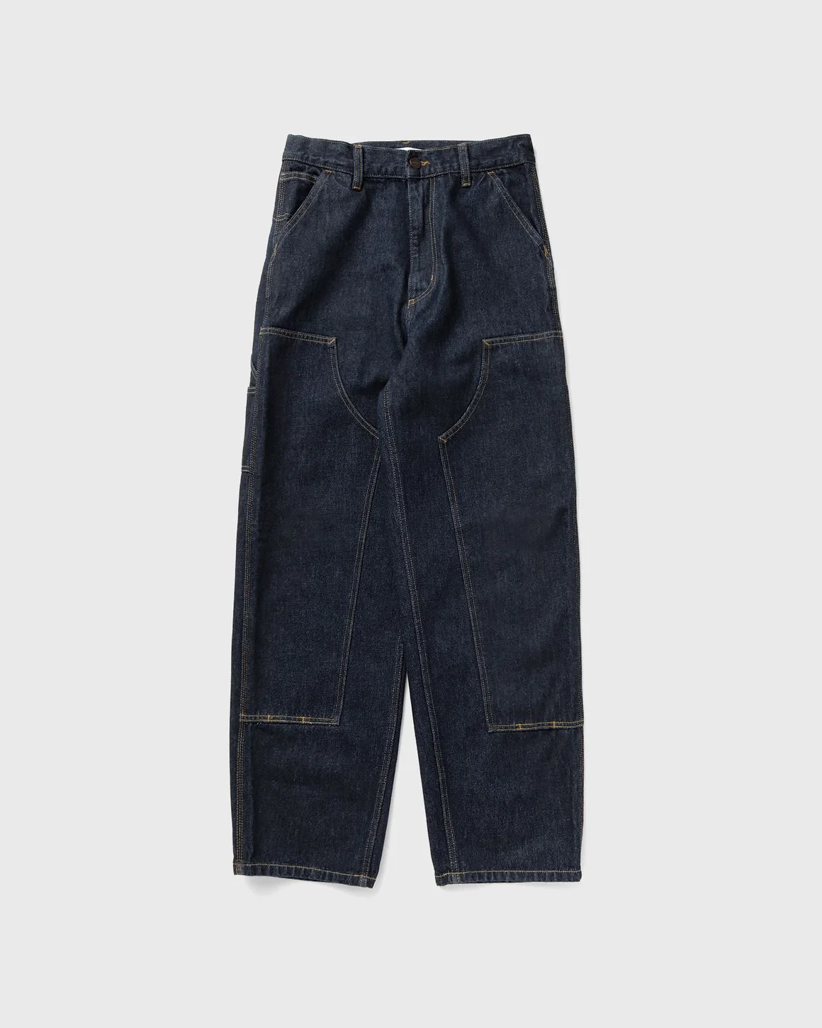 The Carhartt WIP Brandon Double Knee Pant is made from a heavy cotton denim and has a loose fit with a normal waistband height. The style features functional bar tacking and triple seams, double-layered knees, tool pockets and a hammer loop. A square label made of faux leather rounds off the design. - Loose fit - Regular waist - Saddle seam - Triple seams - Double-layered knees - Bar-tacked seams in frequently stressed areas - Tool pockets and hammer loop - Zipper - Square label made of faux leather Article Number: I034635-01.02 Gender: Women Color: Blue Material: 100% Cotton