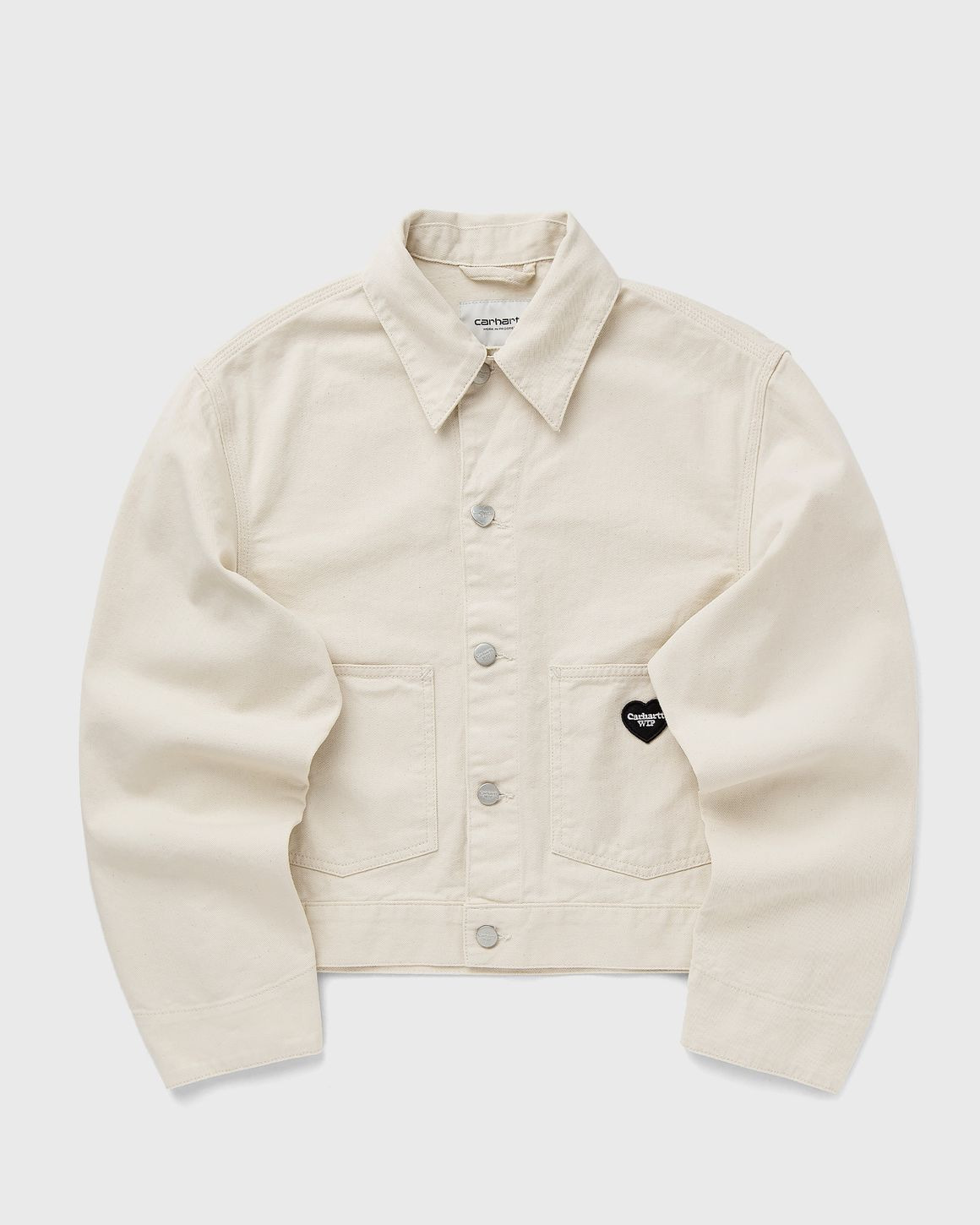 The Carhartt WIP Drewe Jacket is inspired by classic work silhouettes and is made from an unlined, mid-weight cotton twill with triple stitching. The style has two front patch pockets and is finished with a heart patch. - Unlined - Triple-stitched seams - Bar-tacked seams and rivets in high-wear areas - Logo buttons - Two chest pockets, one with flap and button - Inner chest pocket - Adjustable cuffs and waist - Heart patch Article Number: I034845-05.02 Gender: Women Color: NATURAL RINSED Material: 100% Cotton