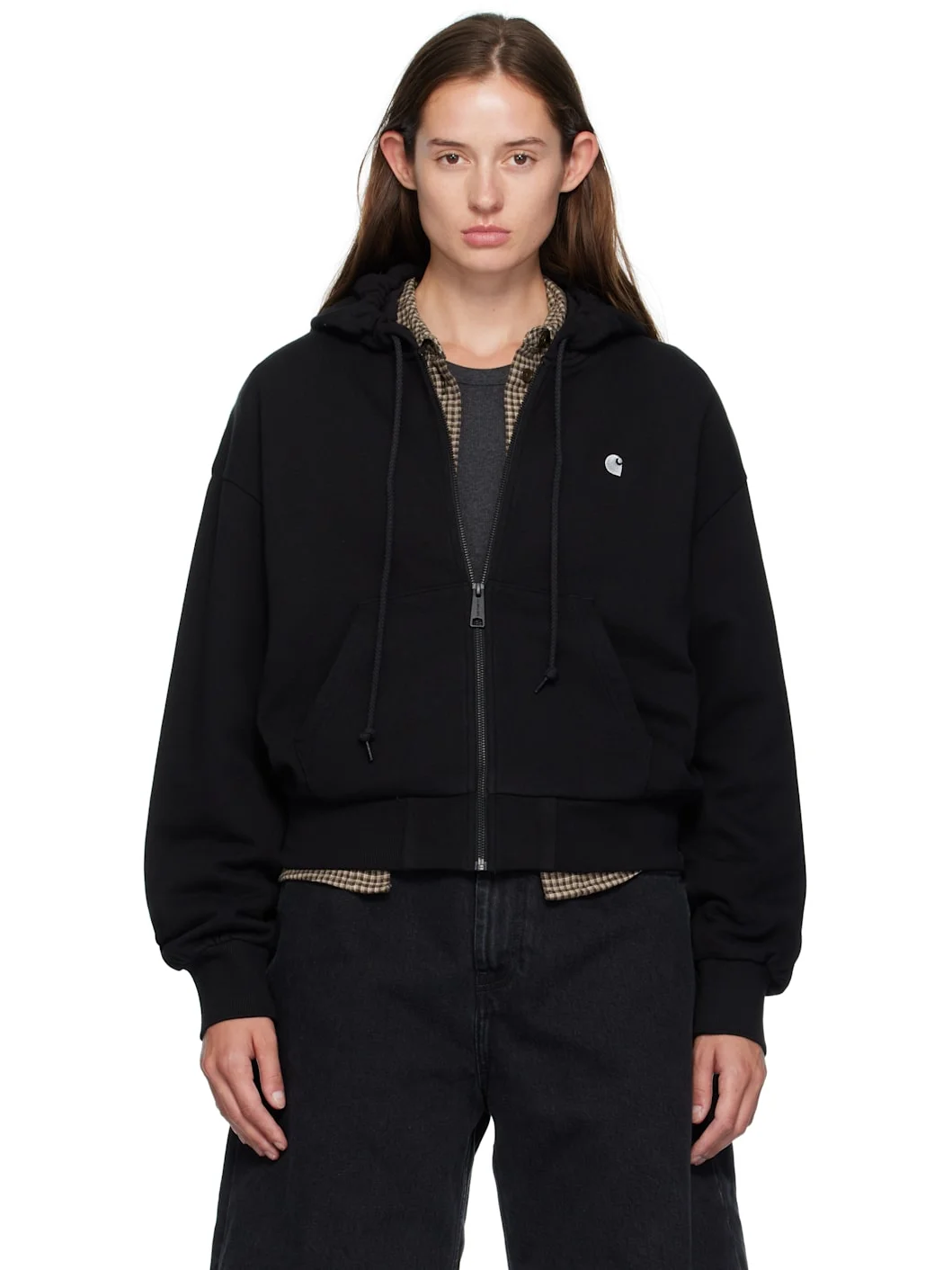 12.3 oz cotton fleece hoodie. · Drawstring at hood · Zip closure · Logo embroidered at chest · Patch pockets at waist · Rib-knit hem and cuffs · Dropped shoulders Supplier color: Black Body: 100% cotton. Trim: 96% cotton, 4% elastane. Pocket lining: 100% cotton. Made in Bangladesh 252111F097000