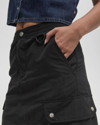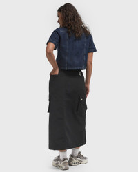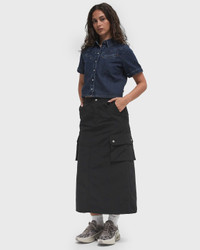 The Carhartt WIP Irwin Skirt is made from a lightweight, water-repellent polyester poplin, has an A-line silhouette and can be adjusted at the hem. The style features two front pockets, two side pockets with flap and button and two back pockets. A woven square label rounds off the design. - Water-repellent - A-line, regular waist - Adjustable and elasticated waistband - Adjustable hem - Two front pockets - Two side pockets with flaps and buttons - Two back pockets with press studs - Bar-tacked seams in frequently used areas - D-ring on the waistband - Zip fastening - Square label Article Number: I034502-89.XX Gender: Women Color: black Material: 100% Polyester