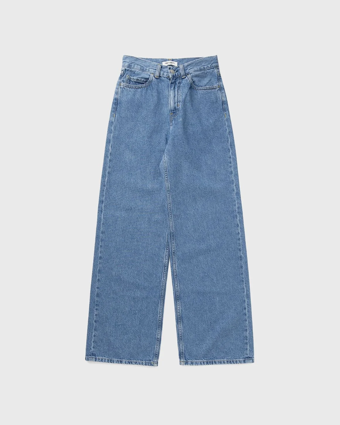 The Carhartt WIP Jane Pant made of organic cotton denim offers a unique shade and wearing comfort thanks to special treatment. With a high waistband and slightly flared leg, the pants have a loose fit. A signature Square label on the back pocket completes the design. - Loose fit, high waistband - Bartack seams in high-wear areas - Zip fly Article Number: I030497-01.60 Gender: Women Color: BLUE HEAVY STONE WASH Material: 100% Cotton