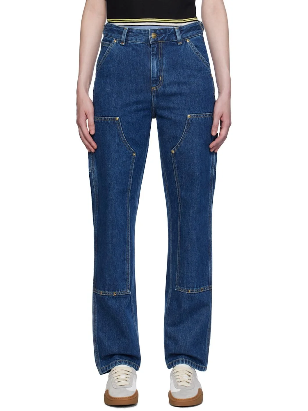 Stone-washed relaxed-fit and straight-leg non-stretch denim jeans. Fading throughout. · Belt loops · Adjustable button tabs at waistband · Five-pocket styling · Zip-fly · Panel at knees · Hammer loop at outseam · Patch pockets at outseams · Logo patch at back pocket · Logo-engraved gold-tone hardware Supplier color: Blue stone washed Body: 100% cotton. Lining: 65% polyester, 35% cotton. Made in Tunisia 242111F069005