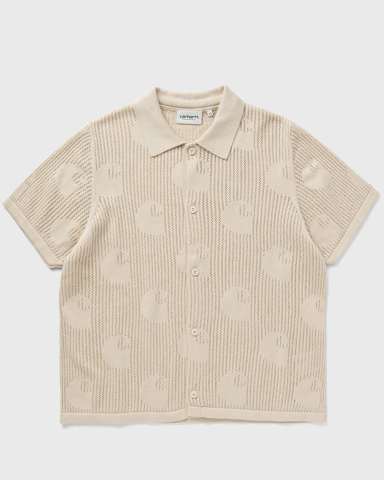 The Carhartt WIP S/S Temple Knit Shirt is a lightweight knit design with an ajour pattern. The style features a collar and button closure. - 100% cotton (12 gg) - Ajour knit with C logo - Short sleeve - Button placket Article number: I034541-2LP.XX Gender: women Color: FLEUR DE SEL Material: 100% Cotton