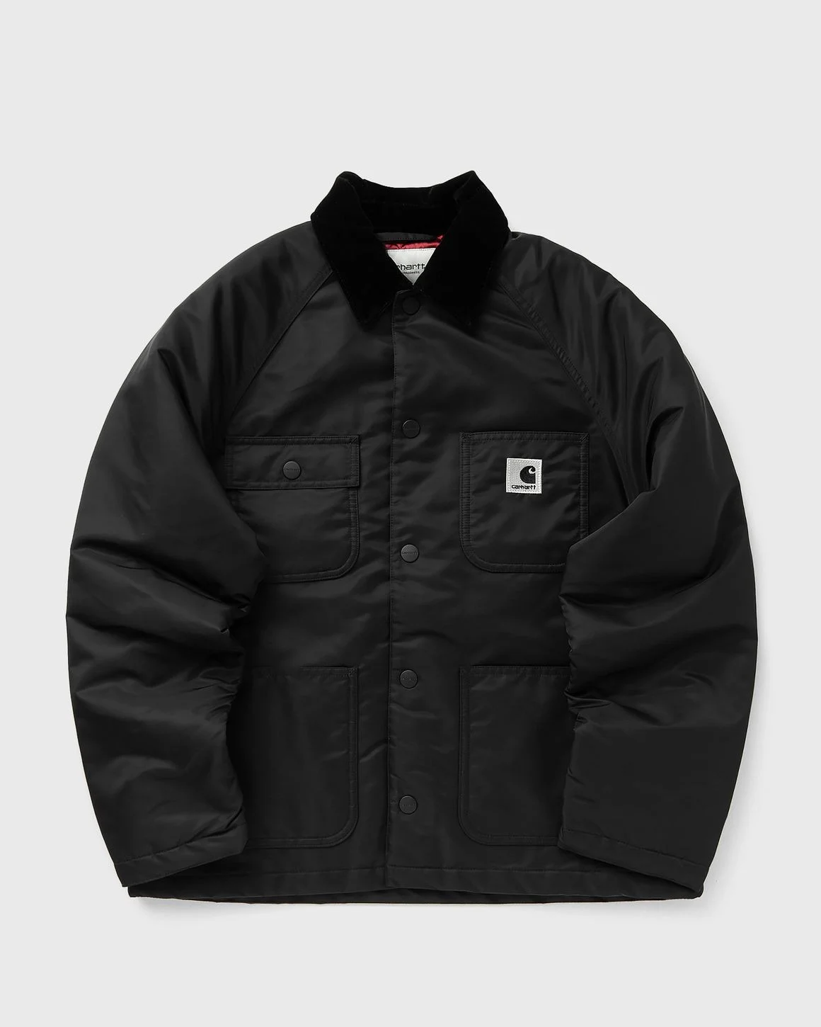 The Carhartt WIP Alumni Chore Coat is made from a medium-weight nylon twill with a contrasting quilted lining. The style features four front pockets and a velvet collar. A woven square label completes the design. - 100% Nylon - Original Loose Fit - Water repellent - Quilted lining - Double seams - Button placket - Adjustable cuffs - 4 pockets, one with flap and button closure - Velvet collar - Square label Article Number: I035149-31Y.XX Gender: Women Color: BLACK / SCARLET Material: 100% Nylon