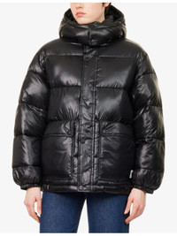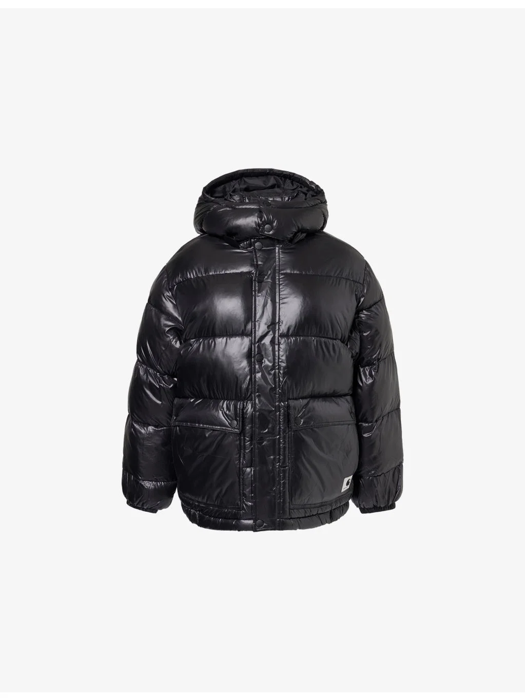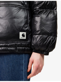 PRODUCT DETAILS - Carhartt WIP shell-down puffer jacket - 100% polyester; lining 100% polyester; pocketlining 100% polyester - Exposed press-stud and concealed zip fastening at front - Relaxed fit, stand-up collar, detachable and adjustable hood, long sleeves, elasticated cuffs, branded hardware, two front flap press-stud pockets with side entry, woven square label at front, elasticated hem, artificial down filling - Machine wash at 30°C - True to size - Size small: length 27.5in / 70cm - Model is 5ft 10in/1.78m and wears a size small - Midweight, non-stretch Ref: R04574778