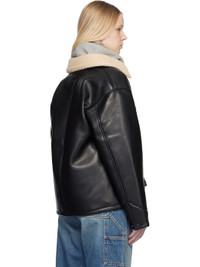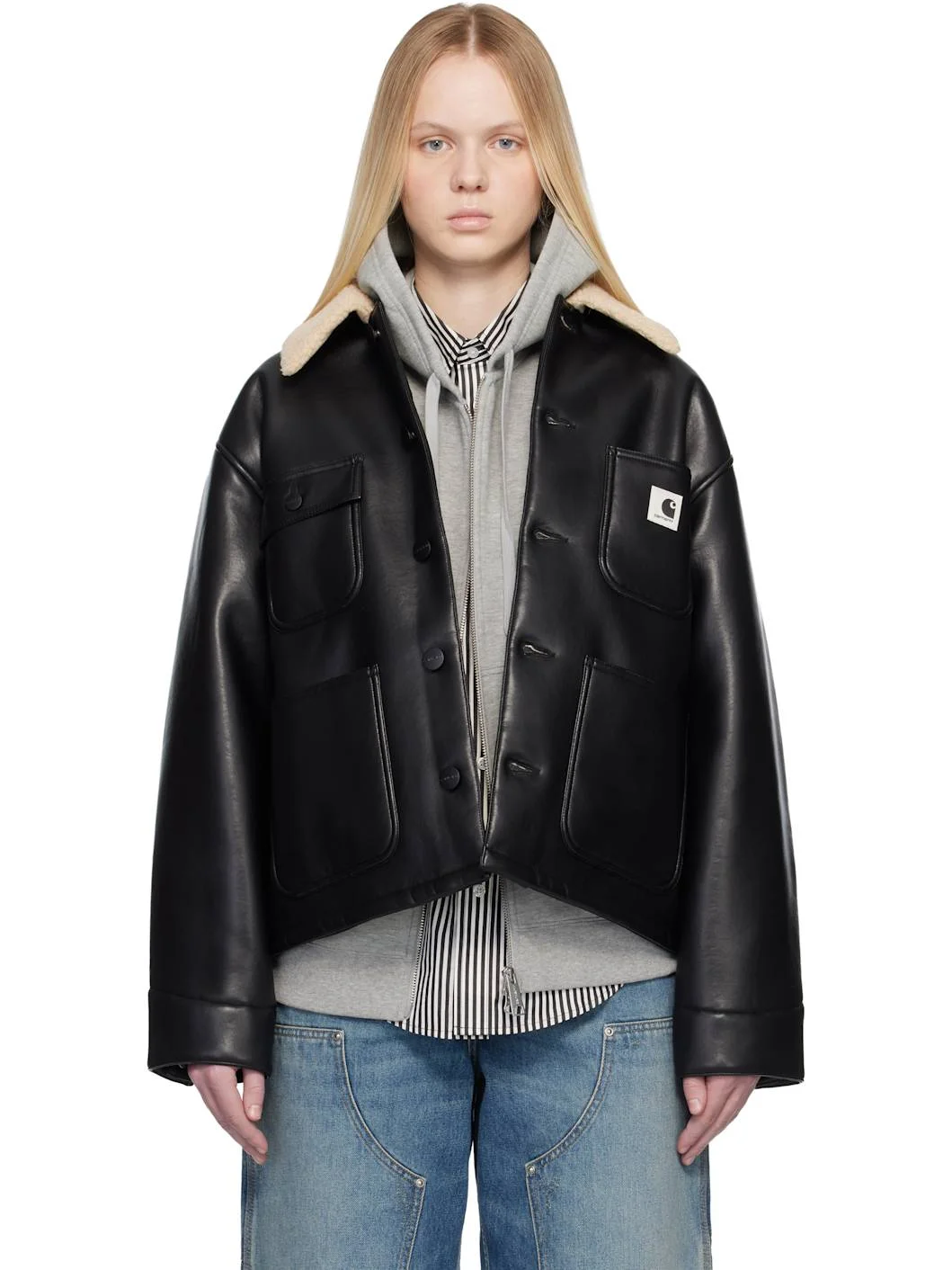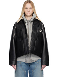 Faux-leather jacket. · Sherpa fleece spread collar · Button closure · Flap and patch pocket with logo patch at chest · Patch pockets at waist · Adjustable buttoned cuffs · Full sherpa fleece lining Supplier color: Black/Natural Body: 67% polyurethane, 33% viscose. Lining: 100% polyester. Made in Cambodia 261111F063004